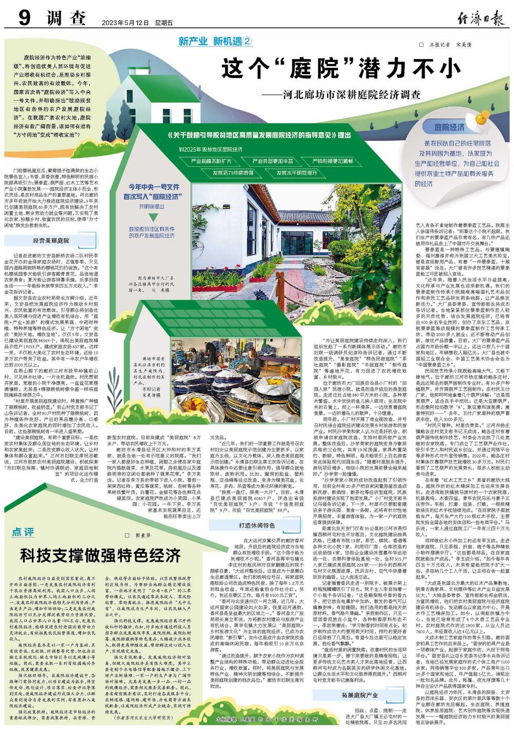 以庭院经济为依托,永清县的服装、文安县的西洋乐器、安次区的第什里风筝等数十个产业群在廊坊先后崛起,生态庭院、养殖庭院、休养旅居庭院、艺术创作庭院等实现快速发展——一幅庭院经济助力乡村振兴的美丽画卷正徐徐展开。