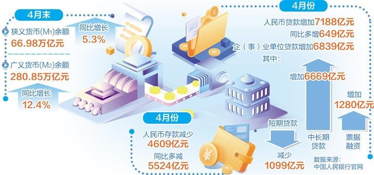 中国人民银行5月11日公布的金融统计数据显示,4月末,广义货币(M_2)余额280.85万亿元,同比增长12.4%,增速比上月末低0.3个百分点,比上年同期高1.9个百分点。4月份人民币贷款增加7188亿元,同比多增649亿元。初步统计,4月份社会融资规模增量为1.22万亿元,比上年同期多2729亿元。