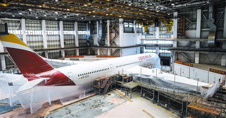 5月11日,在海南自贸港一站式飞机维修产业基地内,喷涂作业员对一架空客A350—900宽体客机进行喷漆打磨工作。完成整机喷涂后,这架飞机将从海口美兰国际机场飞往西班牙首都马德里完成交付。据悉,这是海南自贸港一站式飞机维修产业基地投产以来承接的首单空客A350机型飞机整机喷涂业务。