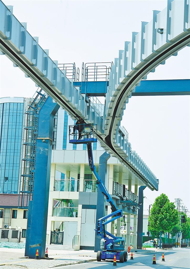 5月13日,上海首条空轨羿鹏空铁示范线项目现场,施工人员正对空中轨道进行安装调试。该示范线项目首期400米轨道及车站已经建成,有望今年下半年试运行。计海新摄(中经视觉)