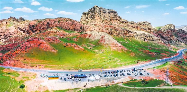 5月13日,游客在新疆昌吉回族自治州呼图壁县天山百里丹霞景区游览。近年来,当地不断完善景区景点公共服务设施,持续提升旅游服务质量,引导当地群众参与旅游产业,全力打响旅游品牌。