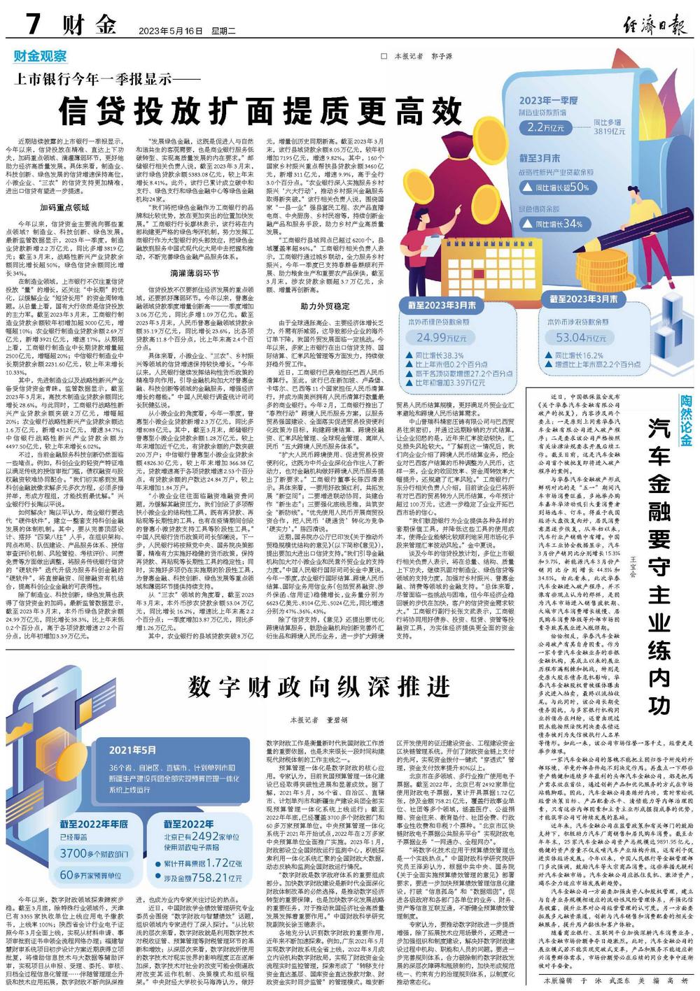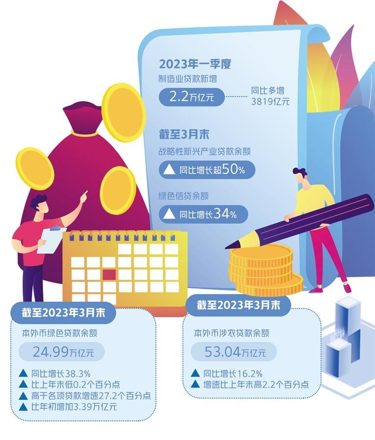 今年以来,信贷资金主要流向哪些重点领域?制造业、科技创新、绿色发展。最新监管数据显示,2023年一季度,制造业贷款新增2.2万亿元,同比多增3819亿元;截至3月末,战略性新兴产业贷款余额同比增长超50%,绿色信贷余额同比增长34%。