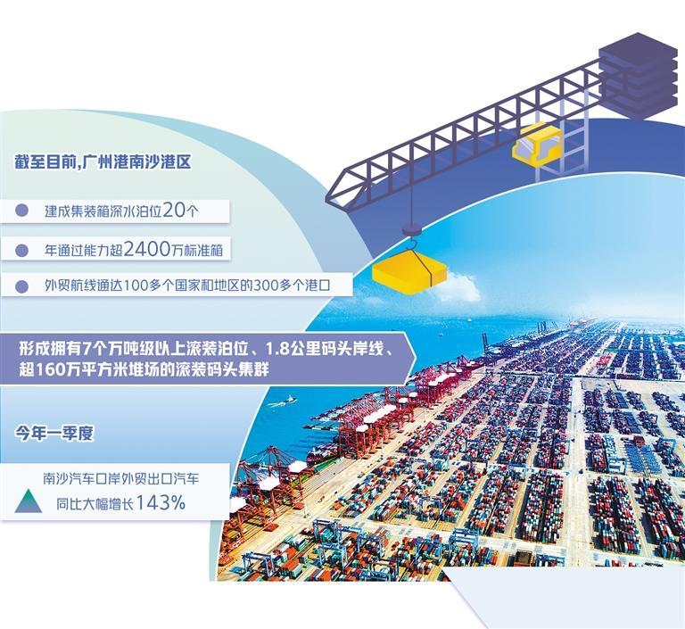 近年来,当地紧抓外贸汽车市场机遇,畅通道、提效率、促创新,助力国产商品车出口驶入“快车道”。截至目前,南沙港已先后建设了南沙汽车码头、海嘉汽车码头,近洋码头,拥有7个万吨级以上滚装泊位、1.8公里码头岸线、超160万平方米堆场的滚装码头集群。今年一季度,南沙汽车口岸外贸出口汽车同比大幅增长143%,保持快速增长势头,有力推动了广州万亿元级汽车产业群的发展。