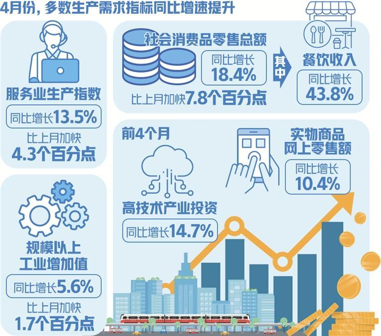 4月份,服务业生产指数同比增长13.5%,比上月加快4.3个百分点。其中,住宿餐饮、批发零售、交通运输等行业的生产指数均明显快于全部服务业生产指数。规模以上工业增加值同比增长5.6%,比上月加快1.7个百分点。社会消费品零售总额同比增长18.4%,比上月加快7.8个百分点,其中餐饮收入同比增长43.8%。全国城镇调查失业率为5.2%,比上月下降0.1个百分点,连续两个月下降。进出口总额同比增长8.9%,其中出口增长16.8%。前4个月,固定资产投资同比增长4.7%,高技术产业投资同比增长14.7%;实物商品网上零售额同比增长10.4%,比前3个月加快3.1个百分点。