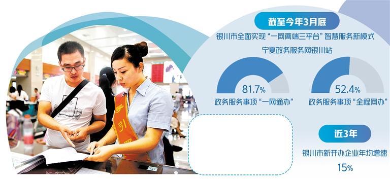 截至今年3月底,银川市全面实现“一网两端三平台”智慧服务新模式,宁夏政务服务网银川站81.7%政务服务事项“一网通办”、52.4%政务服务事项“全程网办”。