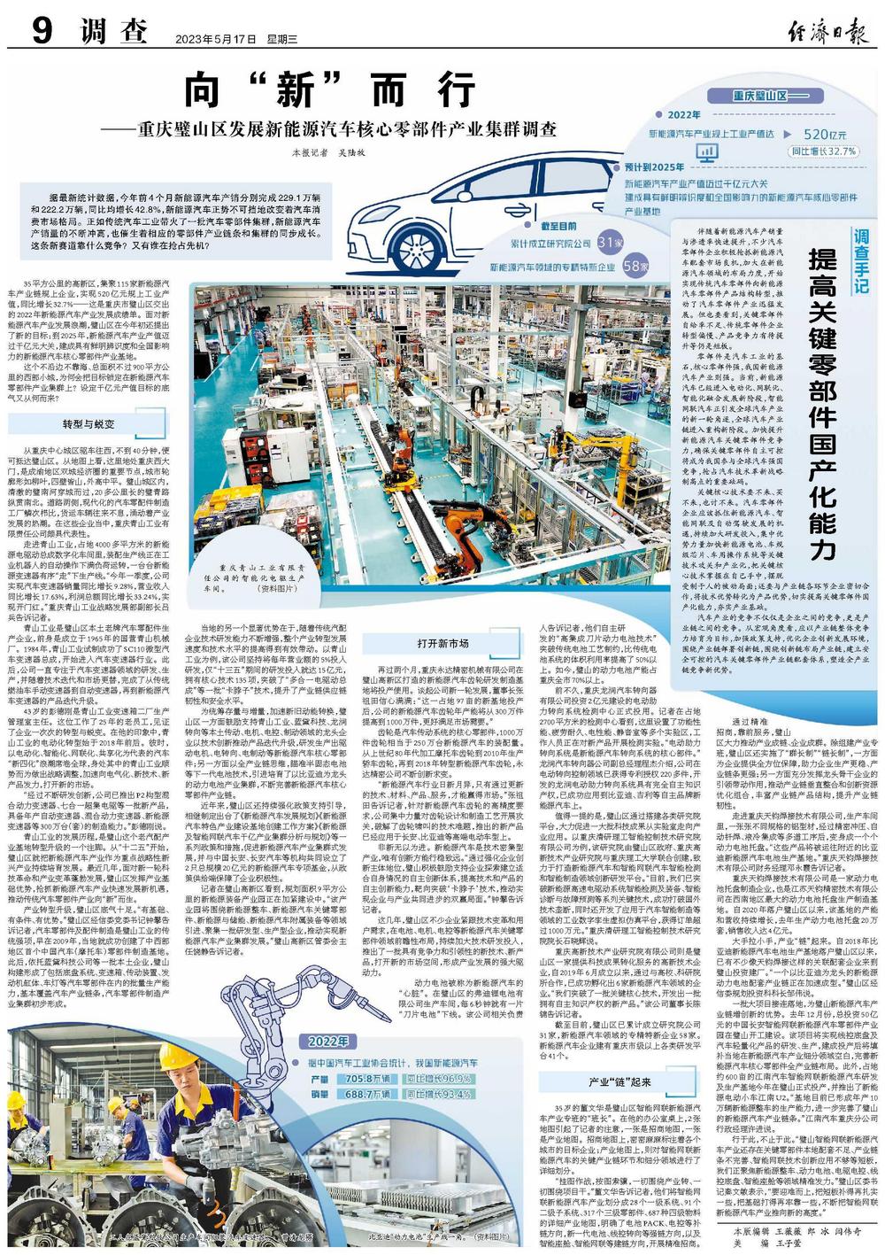 青山工业的发展历程,是璧山这个老汽配产业基地转型升级的一个注脚。从“十二五”开始,璧山区就把新能源汽车产业作为重点战略性新兴产业持续培育发展。最近几年,面对新一轮科技革命和产业变革蓬勃发展,璧山区发挥产业基础优势,抢抓新能源汽车产业快速发展新机遇,推动传统汽车零部件产业向“新”而生。