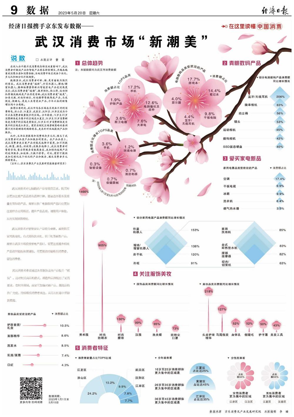 数据显示,武汉消费者对新、潮、美有着较为强烈的需求。武汉消费者爱“追新”,炒菜机器人、擦地/擦窗机器人、腰部按摩器等新兴智能家电产品受到高度关注;武汉消费者爱“追潮”,微单相机、拍立得、运动相机等潮流数码类产品深受青睐;武汉消费者爱“追美”,如秀禾服、时尚防晒衣、时尚腰带等服饰类产品,马尾假发、假睫毛、美发工具等美妆产品,今年以来的销售增长均十分亮眼。