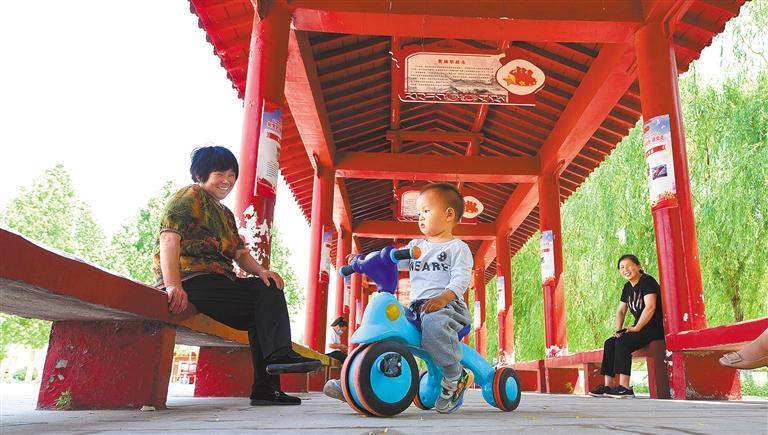 ▲5月18日,山东省阳谷县博济桥街道龙虎寨,居民在改造好的文化长廊休闲。当地通过实施“微改造”,提升小区品质。