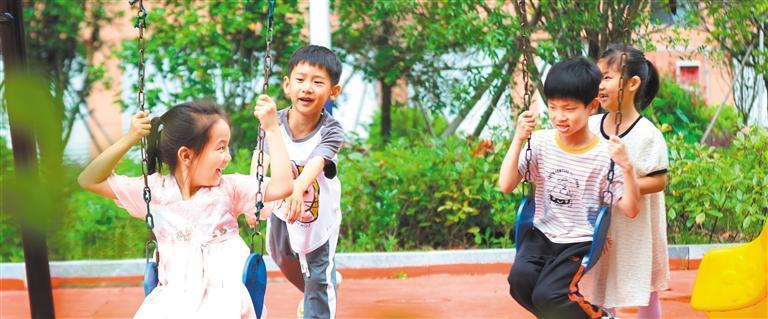 ▼5月19日,江西省横峰县兴安街道城北社区,孩子们在荡秋千。横峰县通过对老旧小区进行改造,让居民在家门口享受高品质的生活环境。