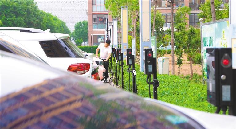 ◀5月19日,河北省廊坊市嘉惠意境小区,居民在为电动汽车充电。老旧小区配套增设充电桩,方便又安全。