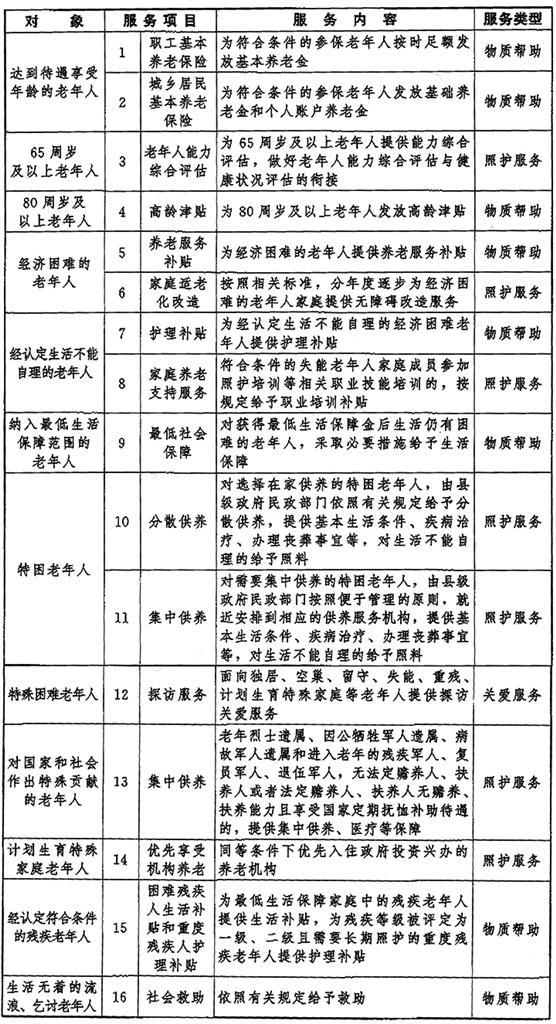 (二)主要任务。基本养老服务是指由国家直接提供或者通过一定方式支持相关主体向老年人提供的,旨在实现老有所养、老有所依必需的基础性、普惠性、兜底性服务,包括物质帮助、照护服务、关爱服务等内容。基本养老服务的对象、内容、标准等根据经济社会发展动态调整,“十四五”时期重点聚焦老年人面临家庭和个人难以应对的失能、残疾、无人照顾等困难时的基本养老服务需求。