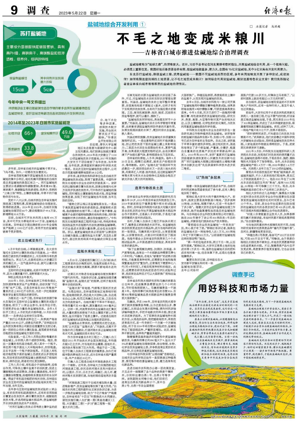 多年来,诸多院校和科研单位也在白城市开展盐碱地改良试验,取得了重要进展。中国科学院东北地理与农业生态研究所就是其一。该研究所以酸性磷石膏为改良剂,探索出物理与化学方法同步快速改良技术,可中和苏打盐碱地的强碱性,同时增加土壤絮凝性和透水性,排盐降碱效果显著,实现了苏打盐碱地当年治理、当年见效的目标。