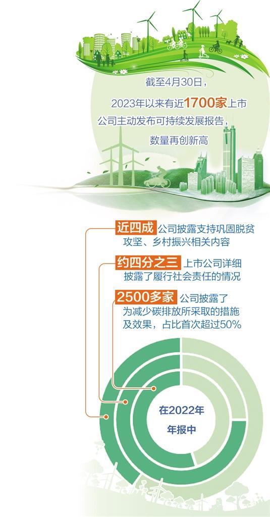 与此同时,资本市场和企业对ESG重视程度快速提升。上市公司逐渐认识到ESG评级良好将是资本市场上的“金名片”,能有效帮助企业建立良好品牌,树立形象,还可以帮助企业吸引投资,甚至能以更低成本进行融资。截至4月30日,2023年以来,主动发布可持续发展报告的上市公司数量再创新高,达到近1700家。2500多家公司在2022年年报中披露了为减少碳排放所采取的措施及效果,占比首次超过50%。约四分之三的上市公司在2022年年报中详细披露了履行社会责任的情况,近四成公司披露支持巩固脱贫攻坚、乡村振兴相关内容。上市公司践行可持续发展理念的主动性进一步提升。