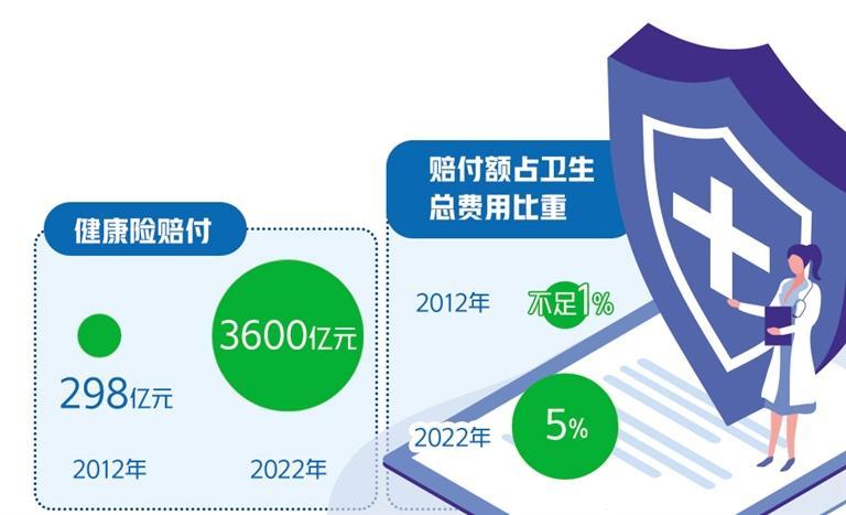 近日,中国保险行业协会党委书记、会长于华在2023清华五道口全球金融论坛上表示,保险服务民生保障成效明显,商业健康保险发展加快。2012年至2022年,健康险赔付从298亿元增长到3600亿元,赔付额占卫生总费用比重从不足1%增长到5%。