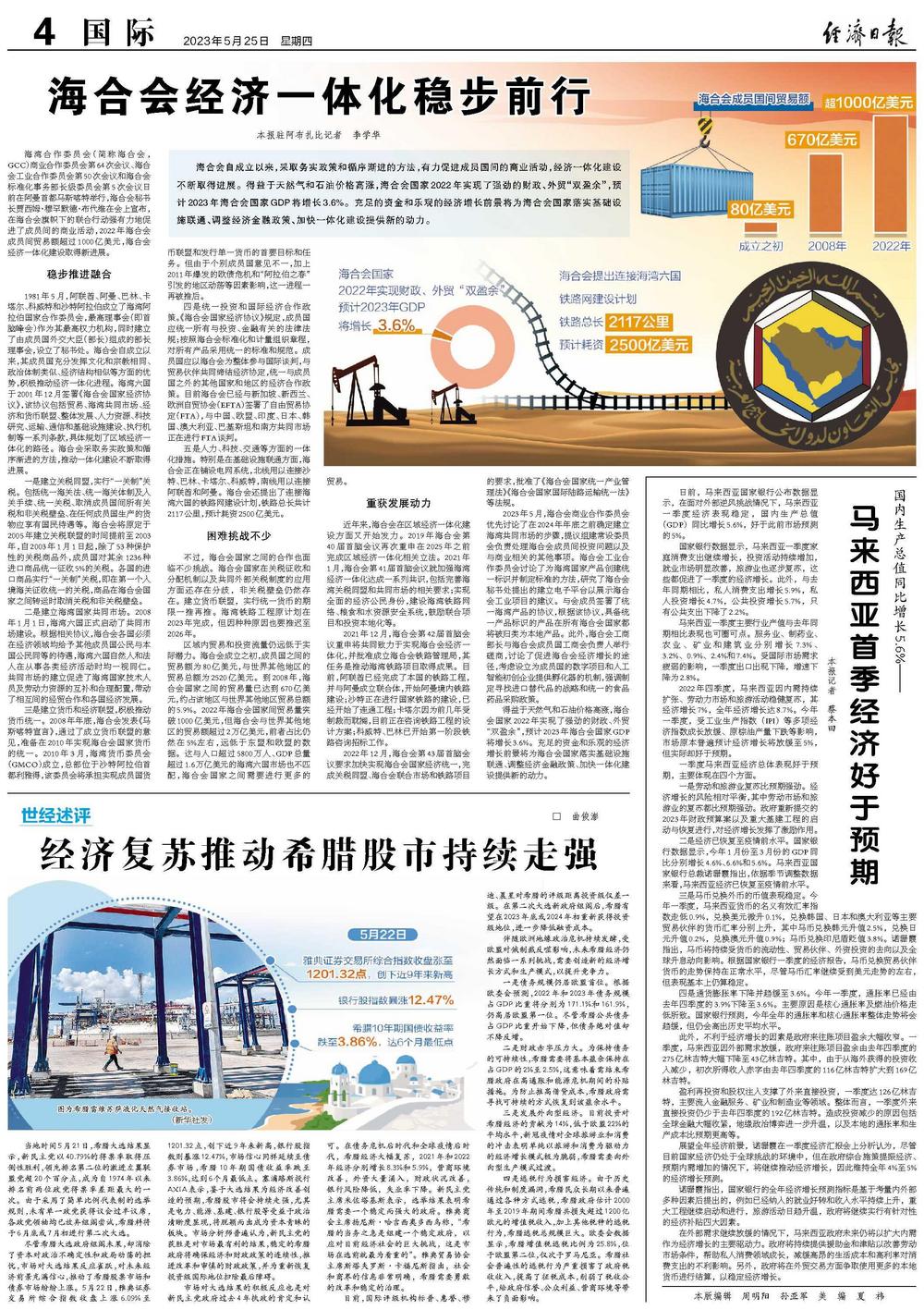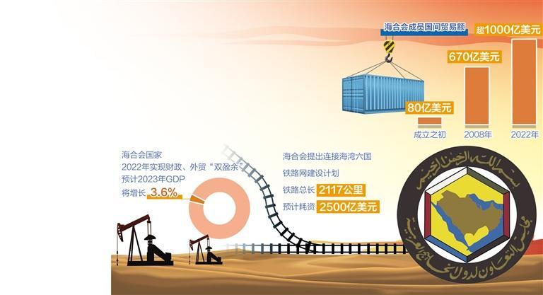 海合会自成立以来,采取务实政策和循序渐进的方法,有力促进成员国间的商业活动,经济一体化建设不断取得进展。得益于天然气和石油价格高涨,海合会国家2022年实现了强劲的财政、外贸“双盈余”,预计2023年海合会国家GDP将增长3.6%。充足的资金和乐观的经济增长前景将为海合会国家落实基础设施联通、调整经济金融政策、加快一体化建设提供新的动力。