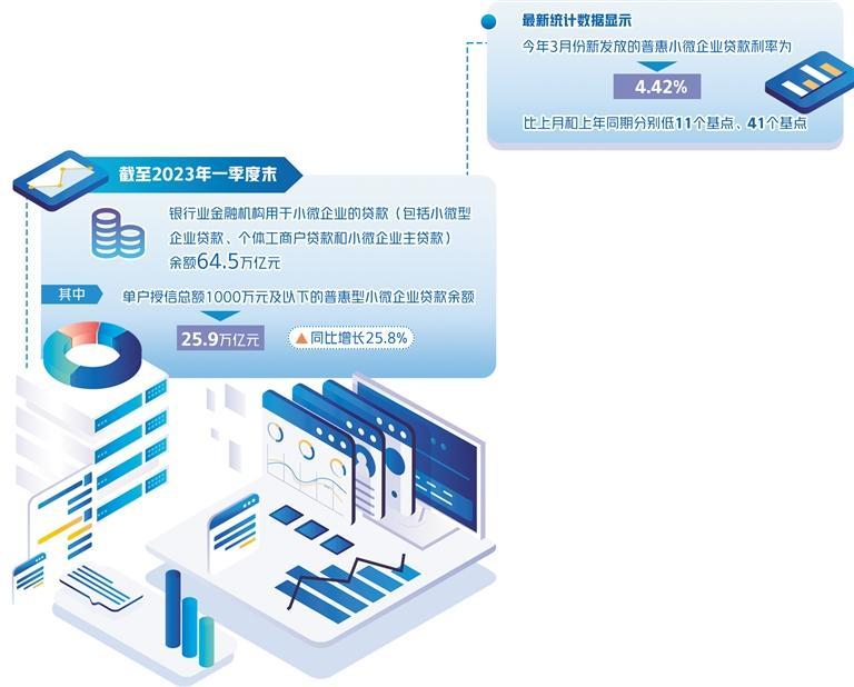 今年以来,小微企业贷款继续保持“增量扩面”态势。国家金融监督管理总局近日发布的数据显示,截至2023年一季度末,银行业金融机构用于小微企业的贷款(包括小微型企业贷款、个体工商户贷款和小微企业主贷款)余额64.5万亿元,其中单户授信总额1000万元及以下的普惠型小微企业贷款余额25.9万亿元,同比增长25.8%。
