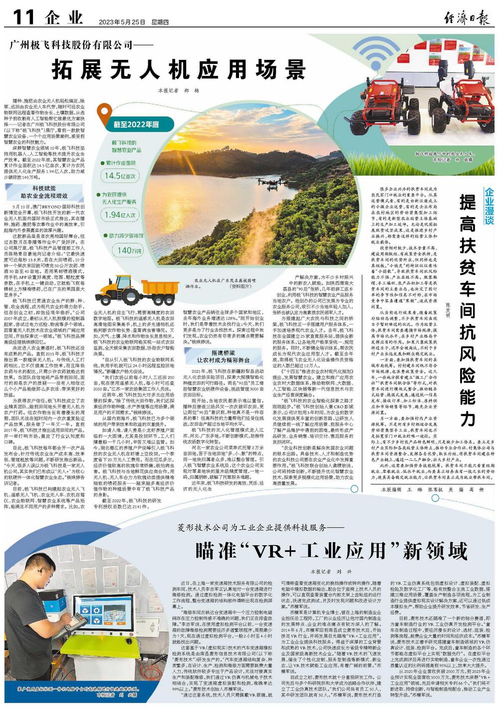 近两年,极飞科技加大对多元应用场景的探索。“除了传统大田作物,我们还探索经济作物种植、水产养殖等应用场景,满足用户的不同需求。”钱姝婷说。