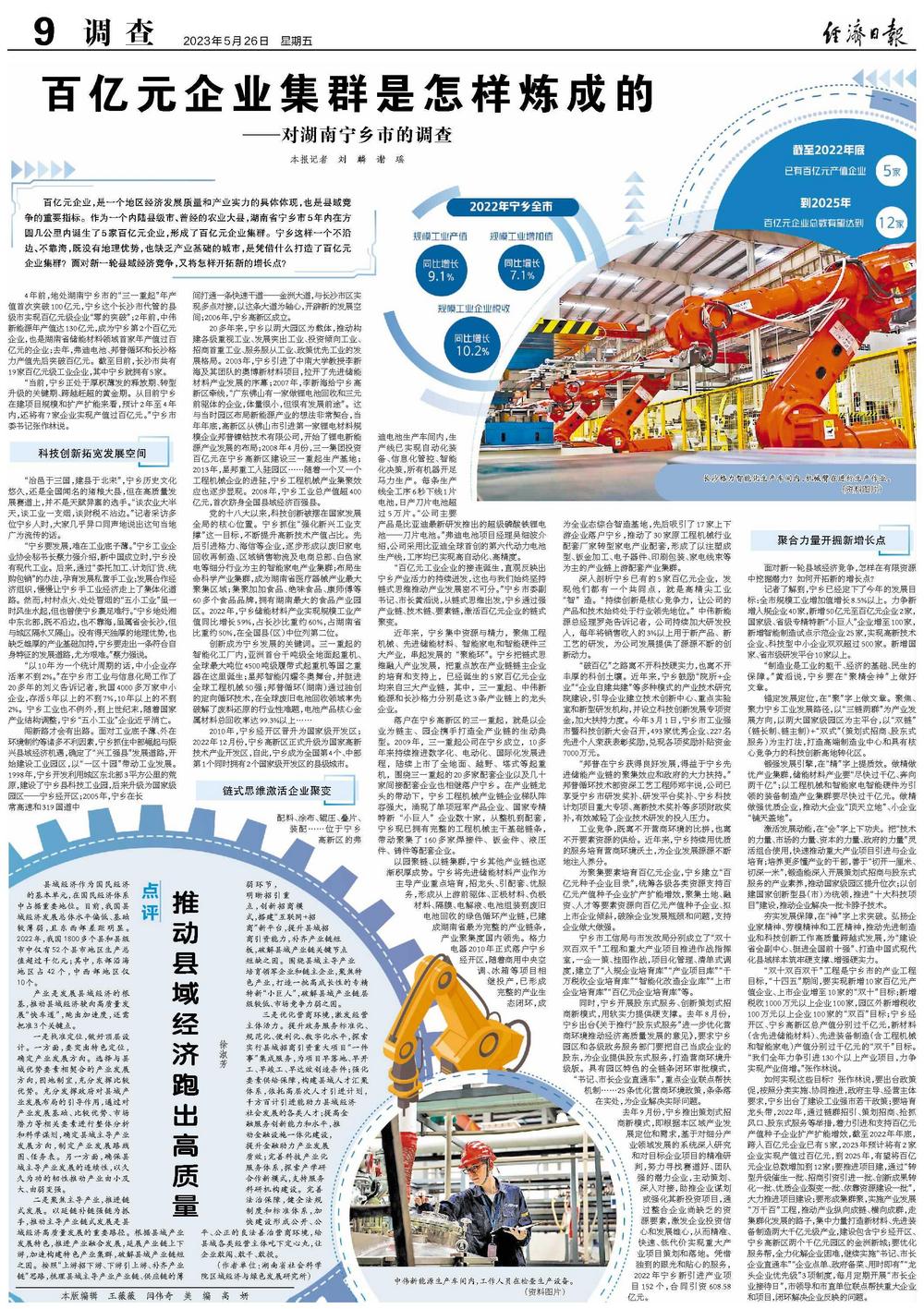 如何实现这些目标?张作林说,要出台政策促,按照分类实施、协同推进,政府主导、经营主体要求,宁乡出台了建设工业强市若干政策;要培育龙头带,2022年,通过链群招引、策划招商、抢抓风口、股东式服务等举措,着力引进和支持百亿元产值种子企业扩产扩能增效,截至2022年年底,跨入百亿元企业已有5家,2023年预计将有2家企业实现产值过百亿元,到2025年,有望将百亿元企业总数增加到12家;要推进项目建,通过“转型升级催生一批、招商引资引进一批、创新成果转化一批、优质企业裂变一批、依靠资源建设一批”,大力推进项目建设;要形成集群聚,实施产业发展“万千百”工程,推动产业纵向成链、横向成群,走集群化发展的路子,集中力量打造新材料、先进装备制造两大千亿元级产业,建设包含宁乡经开区、宁乡高新区两个千亿元园区的金洲新城;要优化服务帮,全力化解企业困难,继续实施“书记、市长企业直通车”“企业点单、政府备菜、用时即有”“龙头企业优先级”3项制度,每月定期开展“市长企业接待日”,市领导和市直单位联点帮扶重大企业和项目,闭环解决企业反映的问题。
