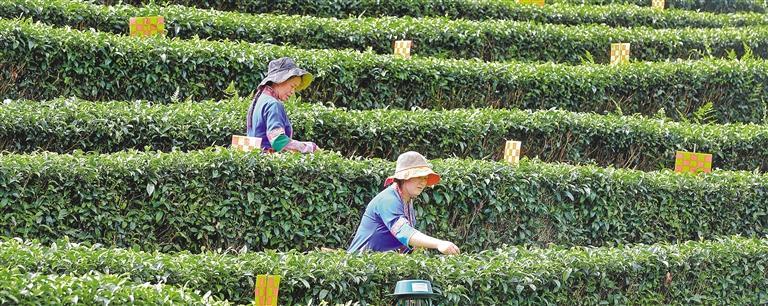 5月26日,在广西三江侗族自治县古宜镇光辉村马湾茶园,茶农在采摘夏茶。