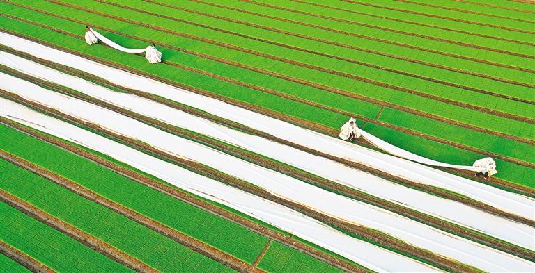 ◀5月22日,江苏省淮安市洪泽区东双沟镇农民在秧苗池揭膜。小麦渐黄、丰收在望,当地农民做好秧苗管护工作,等待麦收后移栽。