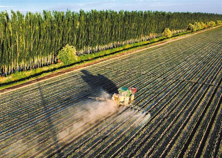 ◀5月22日,农机手驾驶农机在新疆生产建设兵团第二师二十二团种植的色素辣椒地里喷洒作物营养液。