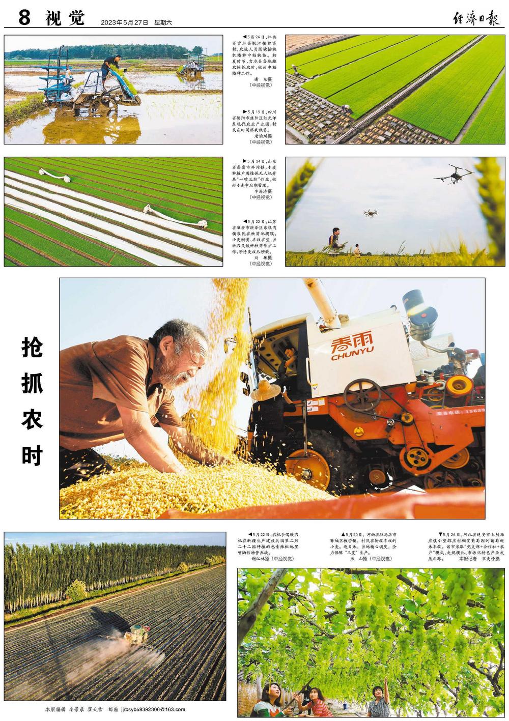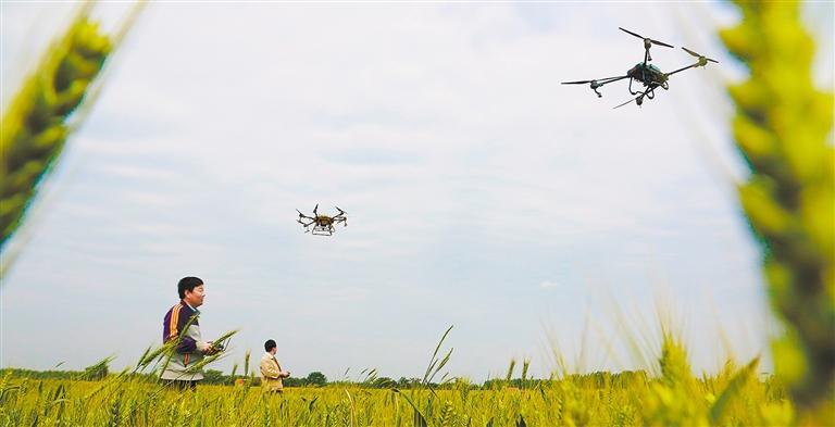 ▶5月24日,山东省高密市井沟镇,小麦种植户用植保无人机开展“一喷三防”作业,做好小麦中后期管理。