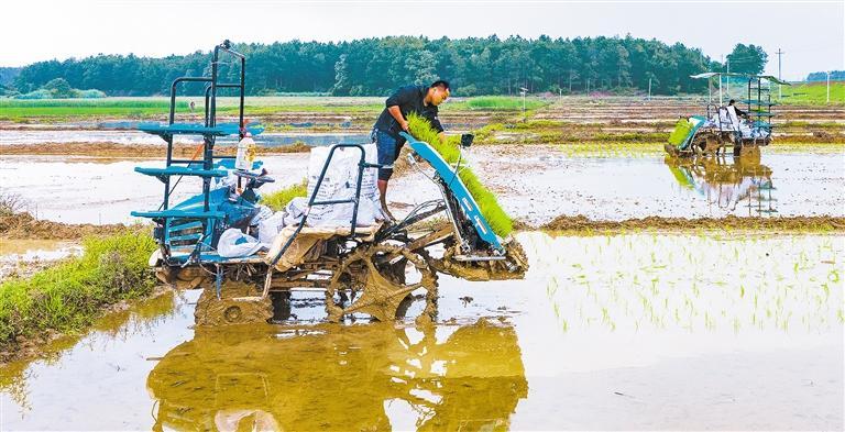 ▶5月19日,四川省德阳市旌阳区红光印象现代农业产业园,村民在田间移栽秧苗。