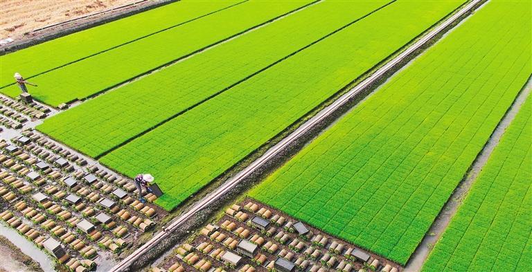◀5月24日,江西省吉水县枫江镇积富村,农技人员驾驶插秧机播种中稻秧苗。初夏时节,吉水县各地粮农抢抓农时,做好中稻播种工作。