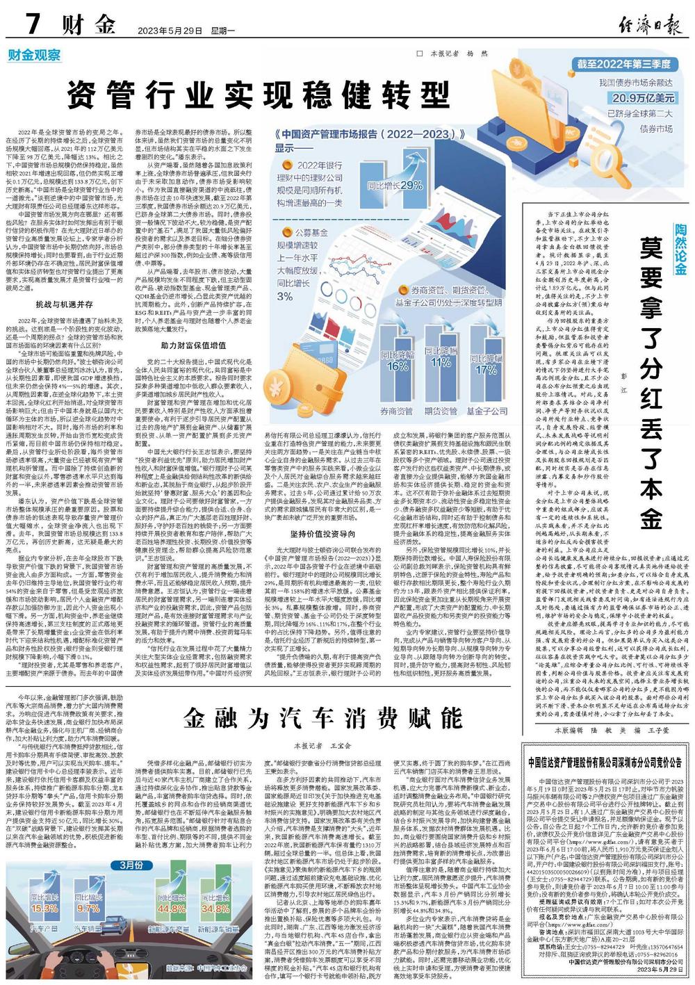 光大理财与波士顿咨询公司联合发布的《中国资产管理市场报告(2022—2023)》显示,2022年中国各资管子行业在逆境中砥砺前行。银行理财中的理财公司规模同比增长29%,是同期所有机构增速最高的一类,但较其前一年158%的增速水平放缓。公募基金规模增速较上一年水平大幅度放缓,同比增长3%。私募规模整体微增。同时,券商资管、期货资管、基金子公司仍处于深度转型期,同比降幅为16%、11%和17%,在整个行业中的占比保持下降趋势。另外,值得注意的是,信托行业经历了新规后的持续转型,第一次实现了正增长。