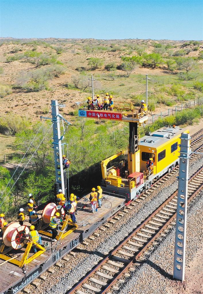 5月29日,建设者在太锡铁路内蒙古锡林郭勒盟桑根达来北至乌日图区间,进行首条接触网承力索架设作业。