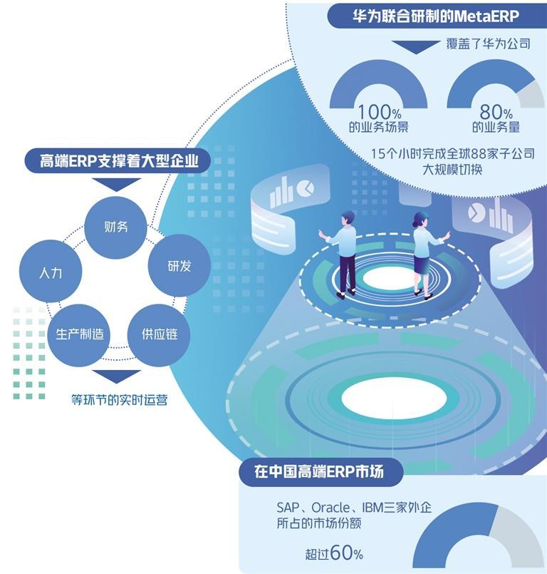 今年4月份,华为联合中国生态伙伴研制成功MetaERP,覆盖了华为公司100%的业务场景和80%的业务量,并用15个小时完成了全球88家子公司的大规模切换。