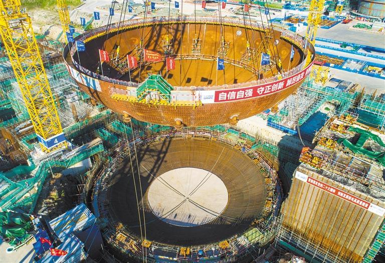 5月29日,中核集团旗下中国核电投资控股的三门核电二期工程4号机组核岛钢制安全壳底封头顺利吊装就位,标志着该厂房主体结构施工开始。该工程建成投产后,三门核电一期、二期装机总容量将达到500万千瓦,将有力保障区域能源供应安全。孙金标摄(中经视觉)
