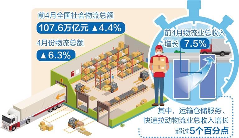 从供给看,随着市场进一步畅通,物流趋于活跃,物流业总收入加速恢复,物流供给规模稳步上升。1月份至4月份,物流业总收入增长7.5%,增速比一季度提高0.8个百分点。其中运输仓储服务、快递领域贡献显著,拉动物流业总收入增长超5个百分点。“前4月物流供给好于预期,各运输方式货运量、货物周转量、港口吞吐量都实现快速增长。”胡焓认为,这反映出与需求保持合理适配的增长,企业微观经营向好是供给质量向好的重要指征,企业经营收入和利润同步增长,而且比前3月有进一步改善。实际上,从过去3年疫情来看,物流供给的韧性经受住高强度考验,是物流需求恢复的重要基础。