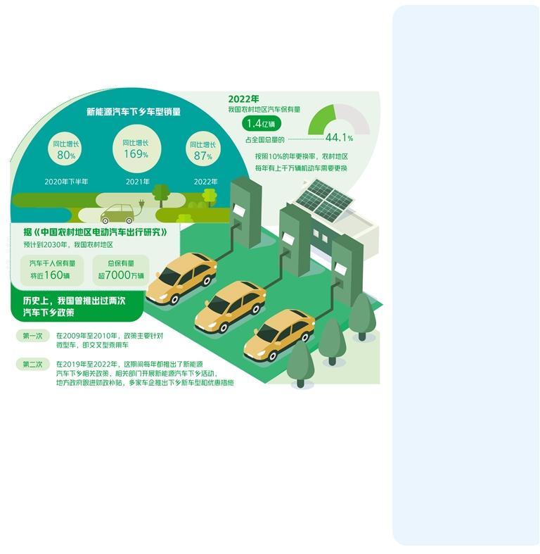 数据显示,自2020年7月起,工信部、农业农村部、商务部等多部门连续开展新能源汽车下乡活动。经过近3年努力,2020年下半年、2021年、2022年新能源汽车下乡车型销量同比分别增长80%、169%、87%。
