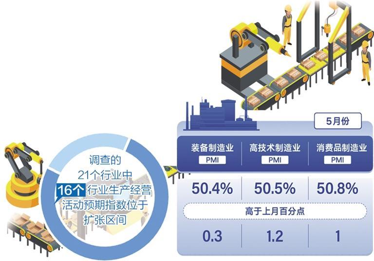 “5月份,四大行业指数变化呈现明显的结构分化特征。”中国物流信息中心专家文韬分析,基础原材料行业PMI为45.8%,较上月下降2.1个百分点,是导致制造业PMI整体下降的主要因素,生产指数和新订单指数都降至45%以下,显示基础原材料市场供需两端同步收缩。装备制造业、高技术制造业和消费品制造业PMI较上月有不同程度扩张,显示三大行业在经历短期波动后较快趋稳回升。从今年以来的指数走势看,传统的基础原材料行业处于持续下行势头,而装备制造业和高技术制造业等新动能保持稳定上升趋势,产业结构的新旧动能转换加快推进。