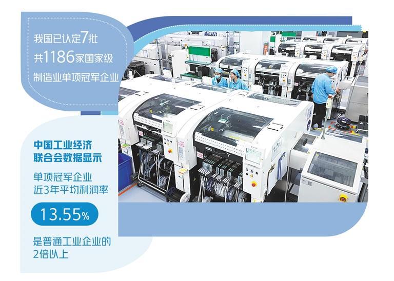 中国工业经济联合会数据显示,单项冠军企业近3年平均利润率为13.55%,是普通工业企业的2倍以上。九成以上的单项冠军企业国内市场占有率第一,近七成全球市场占有率第一。