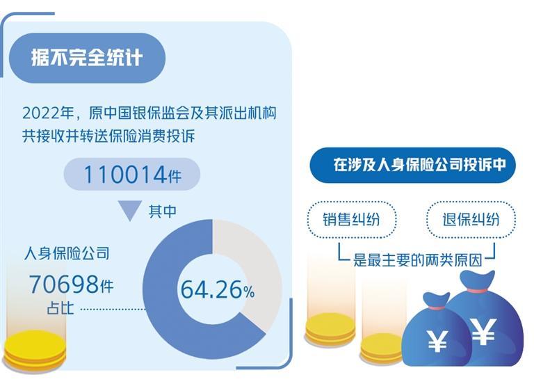 据不完全统计,2022年,原中国银保监会及其派出机构共接收并转送保险消费投诉达110014件。其中,涉及财产保险公司39316件,占投诉总量的35.74%;人身保险公司70698件,占比64.26%。在涉及人身保险公司投诉中,销售纠纷、退保纠纷是最主要的两类原因。其中不乏诱骗、怂恿客户非正常退保的现象存在。