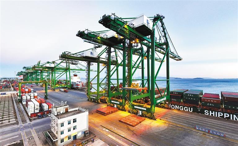 5月29日,福建省福清市江阴港区码头作业区内一派繁忙。据了解,福州港江阴港区目前运营9条RCEP航线、8条“丝路海运”航线。今年1月至4月,港区集装箱吞吐量82.3万标箱,货物吞吐量1126.6万吨。谢贵明摄(中经视觉)