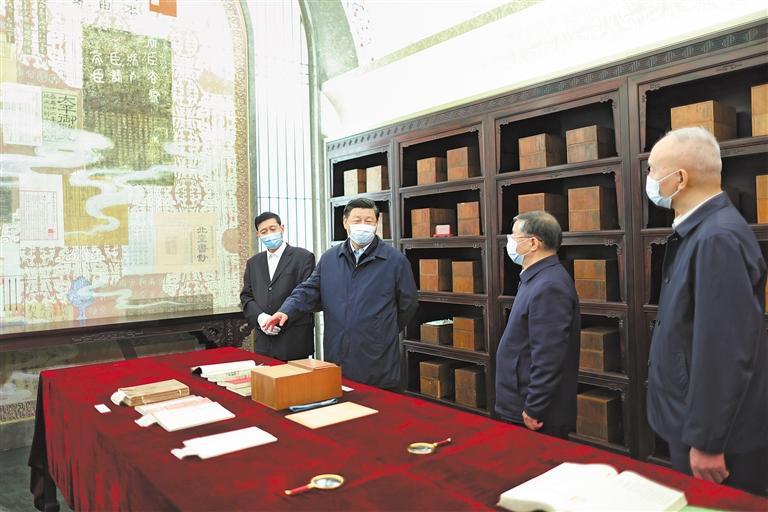 1日下午,习近平乘车来到位于北京市昌平区燕山脚下的中国国家版本馆中央总馆。中国国家版本馆主要承担国家版本资源规划协调、普查征集、典藏展示、研究交流和宣传使用职责,建有中央总馆和西安、杭州、广州分馆。习近平首先走进文华堂,听取版本馆规划建设有关情况介绍,参观国家书房、中华古代文明版本展、中国当代出版精品与特色版本展。在文瀚阁,习近平仔细察看马克思主义中国化时代化经典版本展,不时询问版本搜集整理有关情况,并登上五层露台俯瞰版本馆全貌。随后,习近平来到兰台洞库,参观“汉藏蒙满文大藏经雕版合璧”和“《四库全书》合璧”库展,详细了解馆藏精品版本保存情况。习近平强调,我十分关心中华文明历经沧桑流传下来的这些宝贵的典籍版本。建设中国国家版本馆是我非常关注、亲自批准的项目,初心宗旨是在我们这个历史阶段,把自古以来能收集到的典籍资料收集全、保护好,把世界上唯一没有中断的文明继续传承下去。盛世修文,我们这个时代,国家繁荣、社会平安稳定,有传承民族文化的意愿和能力,要把这件大事办好。我对中国国家版本馆的建成和管理是肯定的、满意的。国家版本馆的主要任务就是收藏,要以收藏为主业,加强历史典籍版本的收集,分级分类保护好。同时,要加强对收藏的研究,以便更好地做好典籍版本收藏工作。在做好主业的前提下,协助各方面做好历史典籍版本的研究和挖掘。总之,建设中国国家版本馆,是文明大国建设的基础工程,是功在当代、利在千秋的标志性文化工程。