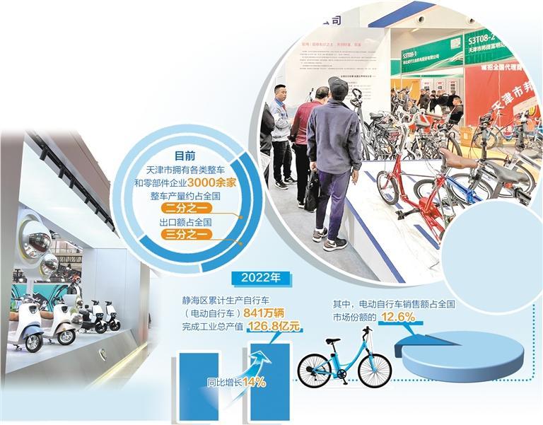 作为基地建设的核心区之一,荣获“中国自行车电动自行车之都”“中国自行车电动自行车产业基地”“天津市新型工业化产业示范基地(自行车)”等诸多荣誉的天津市静海区,在推动自行车业高端化转型和“走出去”过程中表现抢眼。2022年,静海区累计生产自行车(电动自行车)841万辆,完成工业总产值126.8亿元,同比增长14%。其中,电动自行车销售额占全国市场份额的12.6%。