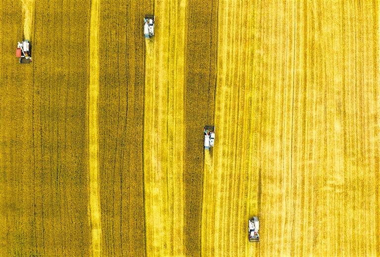 5月30日,农民驾驶农机在江苏省泰州市姜堰区顾高镇塘桥村田间收割小麦。眼下,泰州市255万亩小麦陆续进入收割期,当地农民抢抓晴好天气忙收割。