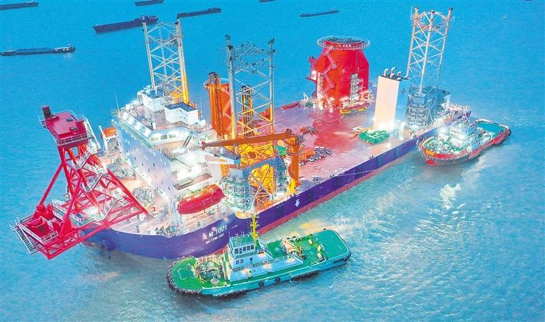 6月5日,由上海振华重工完全自主设计、建造,目前国内起重能力最大的自升自航式风电安装平台“海峰1001”顺利出坞。项目建成后适用于砂性土或类似地质作业,将在海上风电施工领域产生深远影响。许丛军摄(中经视觉)