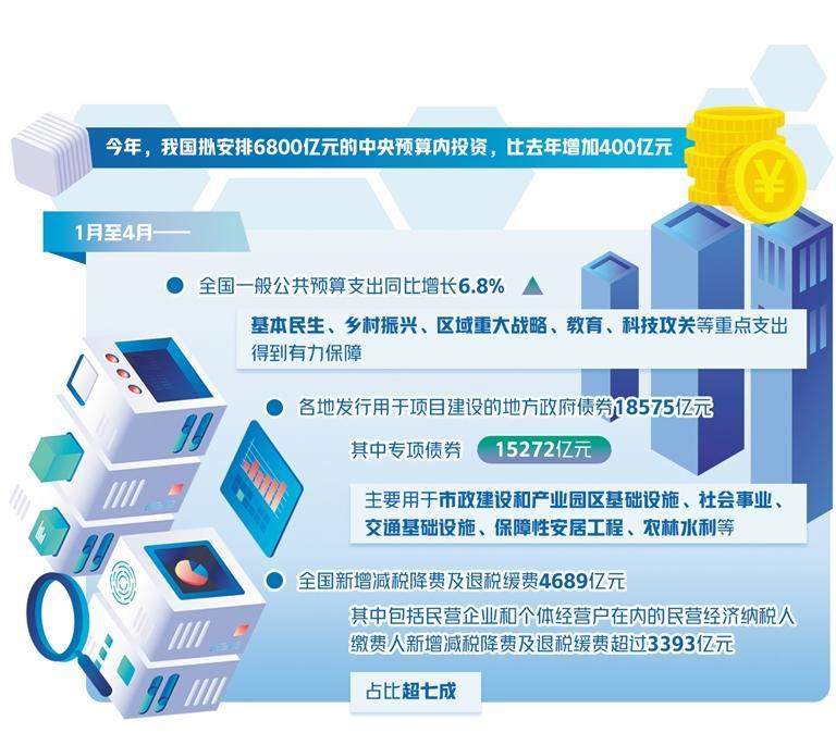 财政部门通过优化组合财政赤字、专项债、贴息等工具,加强财政资源统筹,扩大财政支出规模,支持加快实施“十四五”重大工程,加强交通、能源、水利、农业、信息等基础设施建设。最新数据显示,1月至4月,全国一般公共预算支出同比增长6.8%,基本民生、乡村振兴、区域重大战略、教育、科技攻关等重点支出得到有力保障。