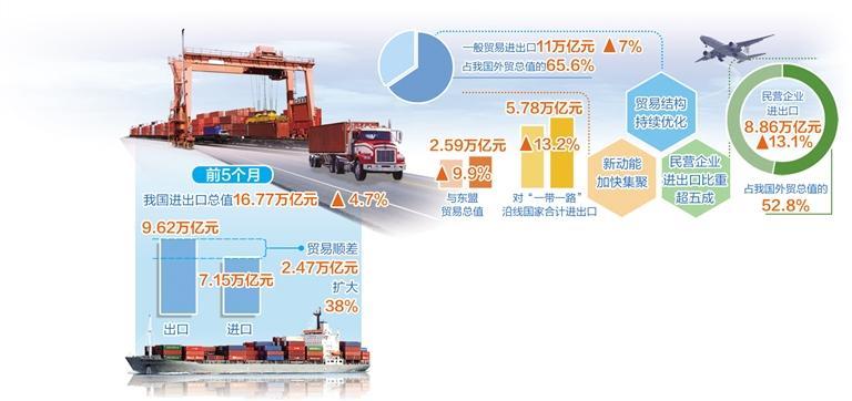 前5个月,我国进出口总值16.77万亿元,同比增长4.7%。其中,出口9.62万亿元,增长8.1%;进口7.15万亿元,增长0.5%;贸易顺差2.47万亿元,扩大38%。