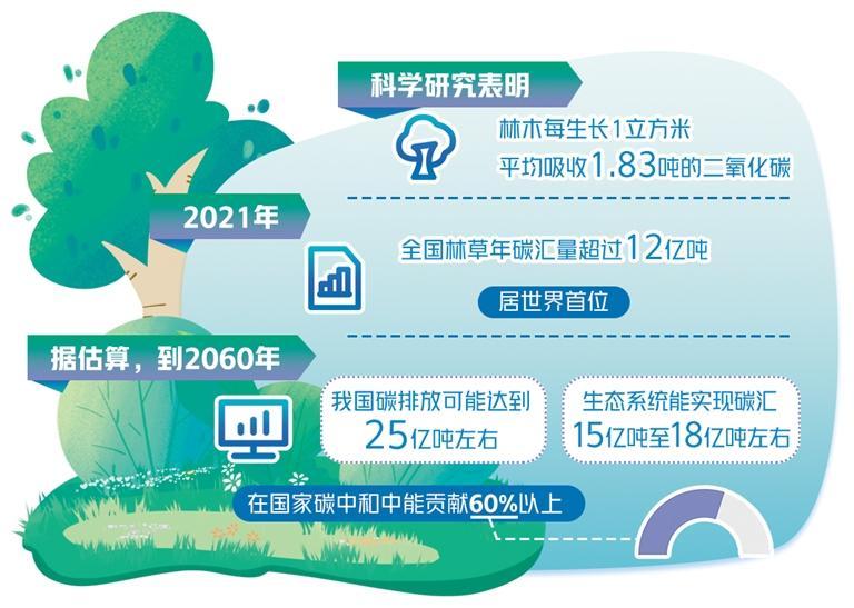 “2020年,我国林草碳汇探明储量885.86亿吨。2021年,全国林草年碳汇量超过12亿吨,居世界首位。”中国工程院院士尹伟伦说。据介绍,世界上有两大二氧化碳吸收途径,一是陆地森林,还有一个是海洋生物。海洋中大量藻类吸收二氧化碳,之后在物质循环、能量代谢中转换成贝壳、碳酸盐类储存起来。陆地上的森林可以长期固碳。科学研究表明,林木每生长1立方米,可平均吸收1.83吨的二氧化碳。