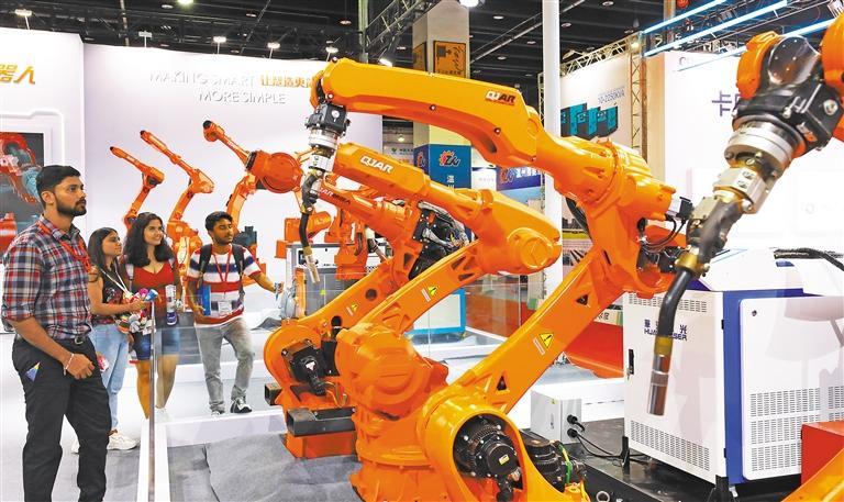6月8日,客商在2023浙江义乌国际智能装备博览会上观看工业机器人操作。