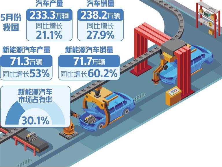 5月份,新能源汽车产销延续快速增长态势,汽车出口贡献显著,中国品牌乘用车市场份额稳定增长。