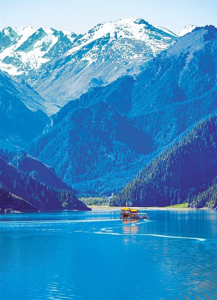 6月10日,游客乘坐游轮在新疆昌吉回族自治州天山天池风景区游览。进入6月,天山天池风景区湖水晶莹澄澈,四周群山环抱、绿草如茵,吸引不少游客前来游玩。陶维明摄(中经视觉)