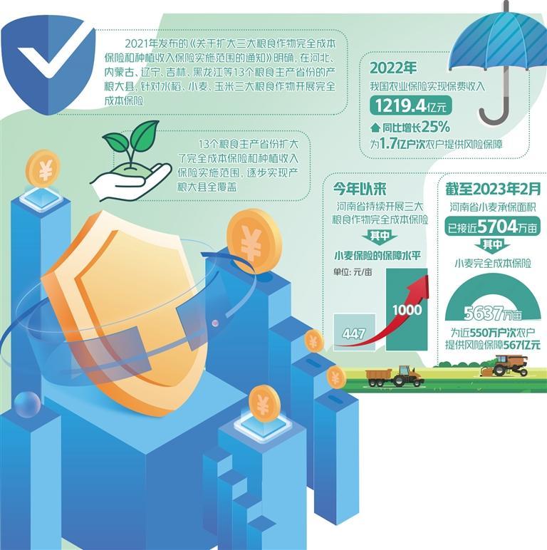 今年以来,河南省在全省持续开展三大粮食作物完全成本保险。其中,小麦保险的保障水平由447元/亩提高至1000元/亩。同时,河南省指导各县市区加强政策宣传,引导广大农户自愿参保。截至2023年2月,该省小麦承保面积已接近5704万亩,其中小麦完全成本保险5637万亩,为近550万户次农户提供风险保障567亿元。
