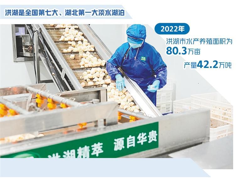 这是洪湖市发展水产品预制菜的一个缩影。洪湖是全国第七大、湖北第一大淡水湖泊,非常适宜发展水产业,淡水养殖面积和淡水产品总量位居全国县级市第一位。2022年,洪湖市水产养殖面积为80.3万亩,产量42.2万吨。